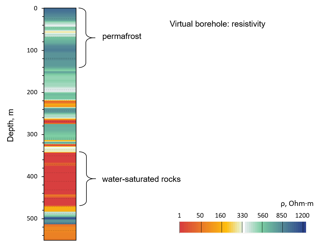 The figure shows an example of determining the distribution of resistivity to a depth of more than 500 m in Eastern Yakutia, the so-called “virtual borehole”. Absolute effective values of resistivity are calculated with a step of 2-5 m, the positions of permafrost and water-saturated rocks correspond to geological data. In geocryological terms, the field site is located in a permafrost zone with a frozen rock base at a depth of approximately 150 m. The area has two tiers of frozen rock separated by a layer with reduced resistivity.